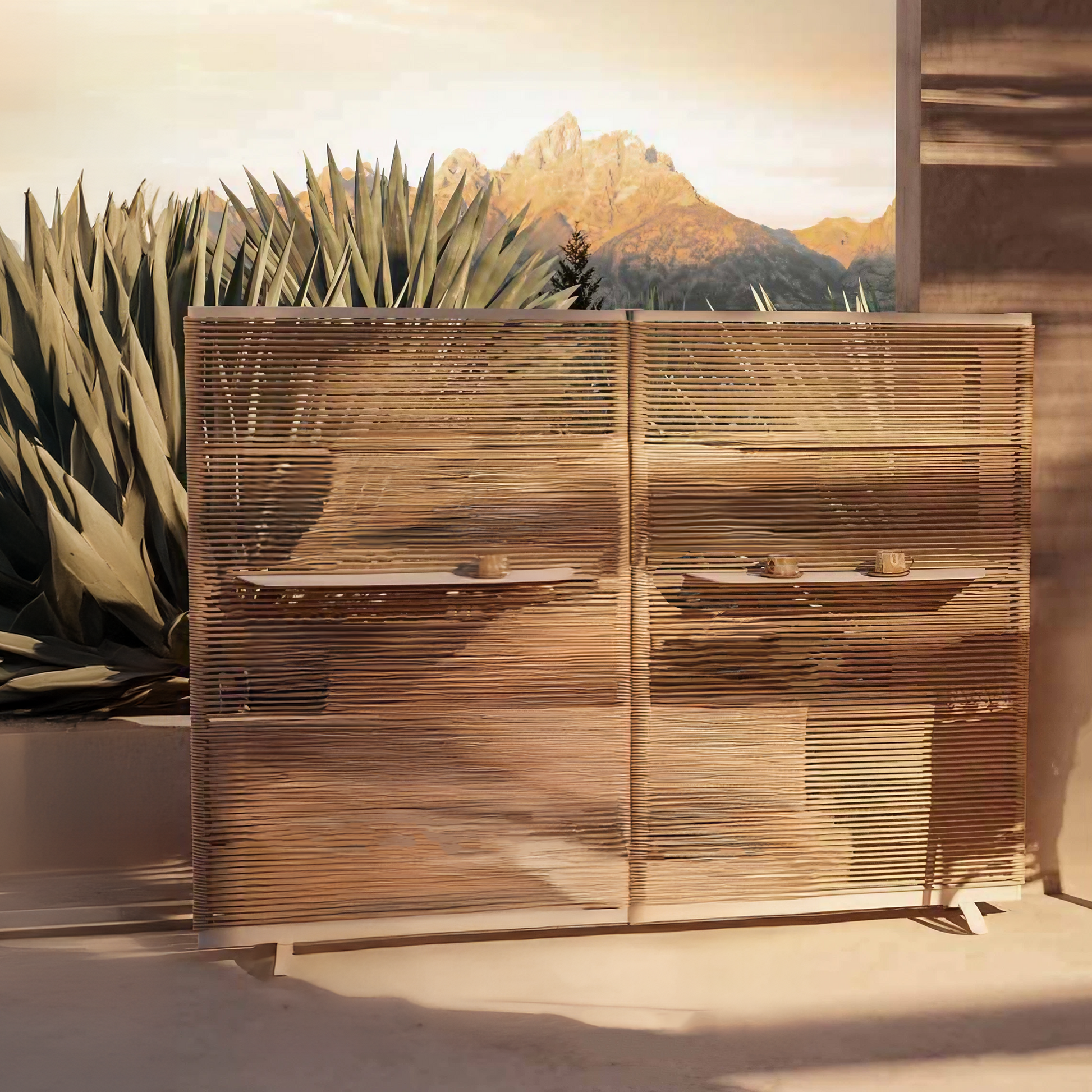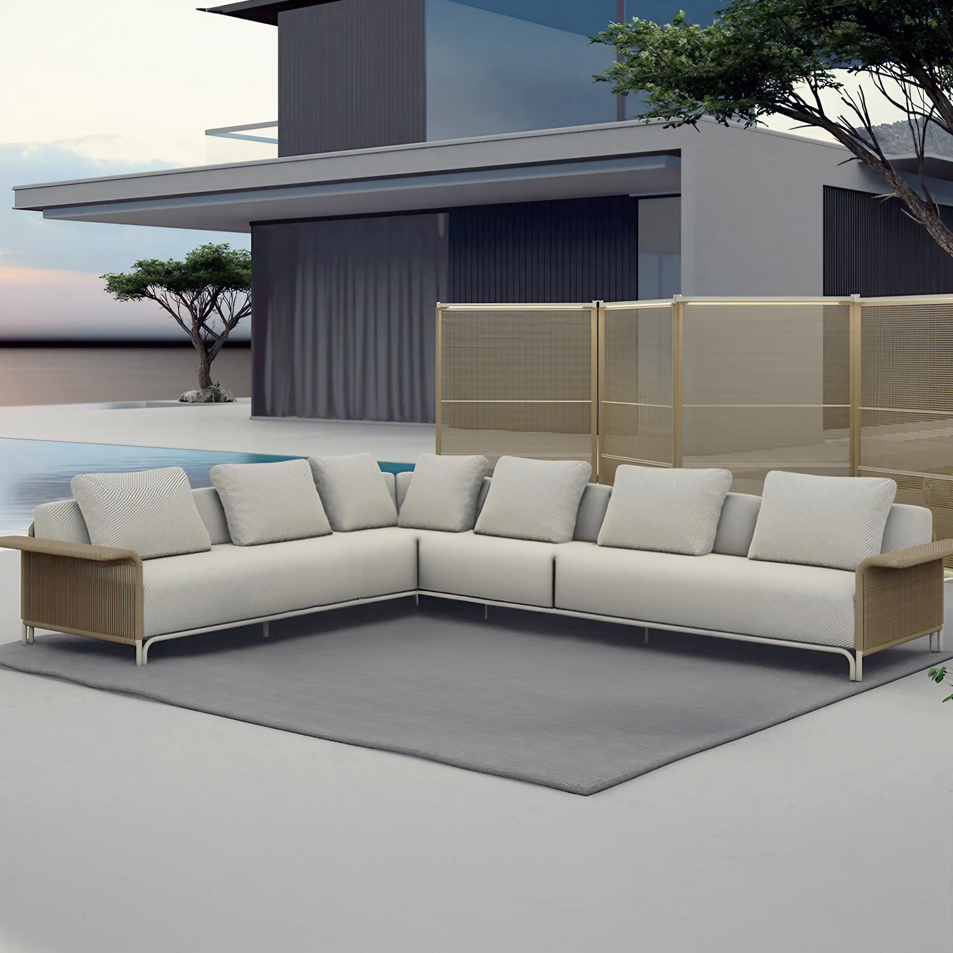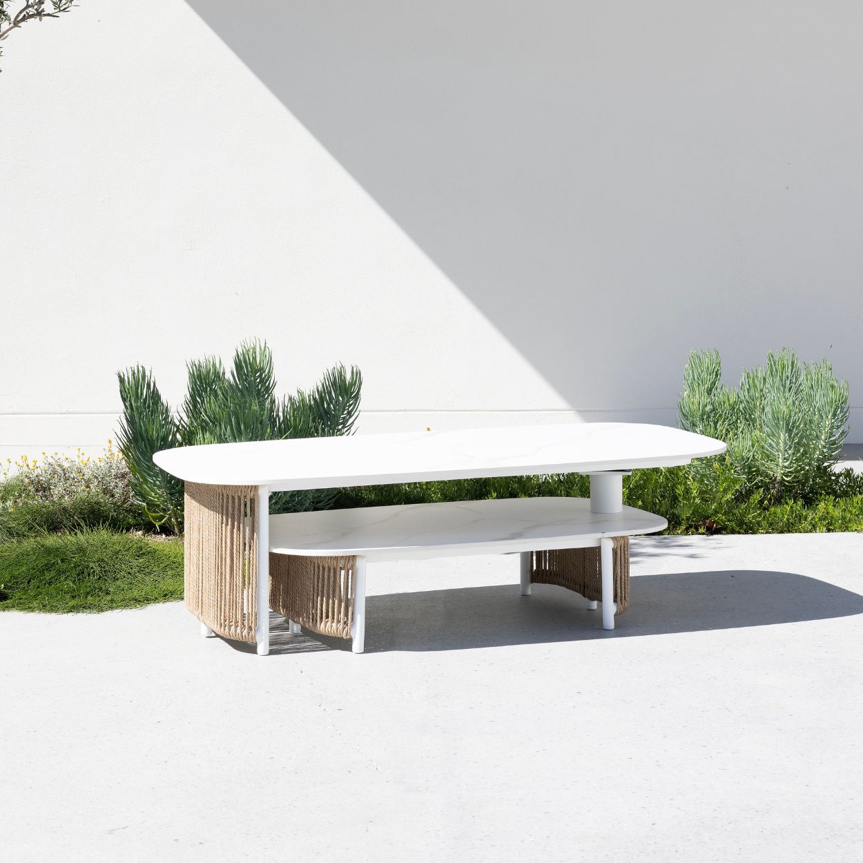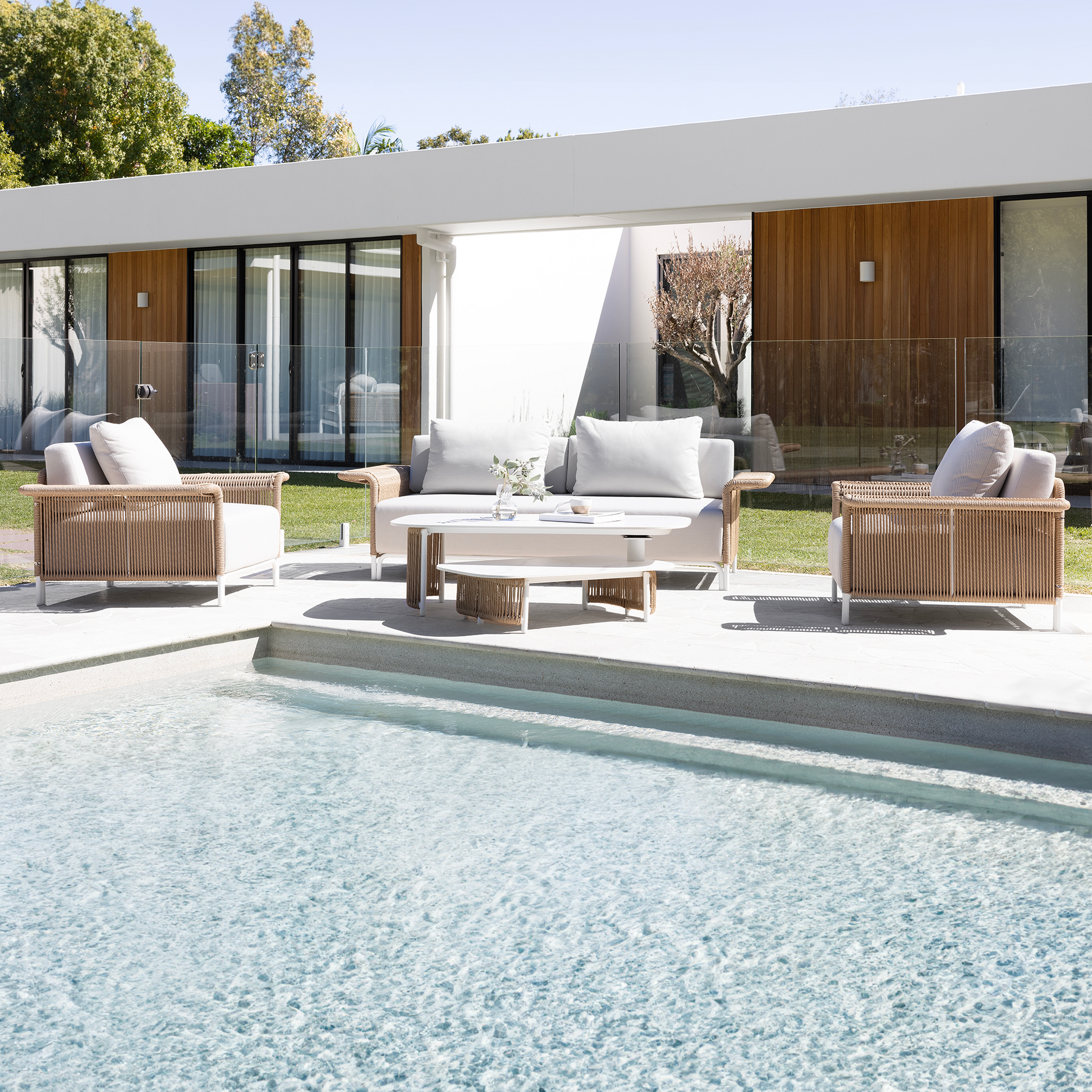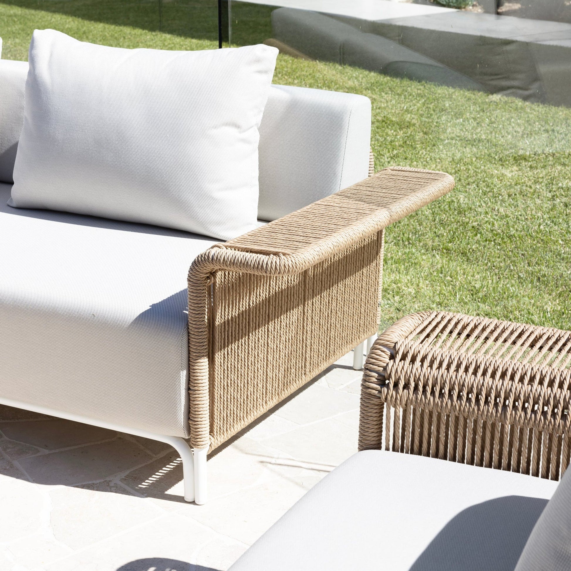 The Novara Collection offers a serene, flowing design with generous armrests. Drawing inspiration from classic rattan furniture, modernised with durable outdoor materials.